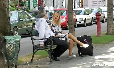 Curvy blond flight attendant gets fucked hard by an senior dude