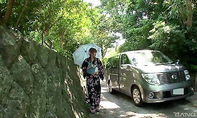 kimono-mädchen in einem wohnmobil gurgelt hart-auf und bekommt spielzeug gestochen