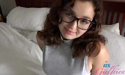 Small titted brunette Sharron with glasses masturbates